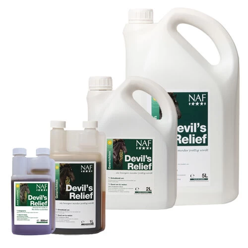NAF Devils Relief von NAF Equine ist ein leistungsfähiges Kräutergetränk aus Extrakten von Teufelskrallenwurzel und weiteren wohltuenden Kräuter-Tinkturen. Das Medikament soll die Gelenke bei Pferden unterstützen, vor allem bei älteren Tieren. Die Kräuter unterstützen den Bewegungsapparat und die Verdauung, da es sich um bittere Kräuter handelt, welche die Magensäfte stimulieren. So kann das Pferd auch im Alter fit bleiben.