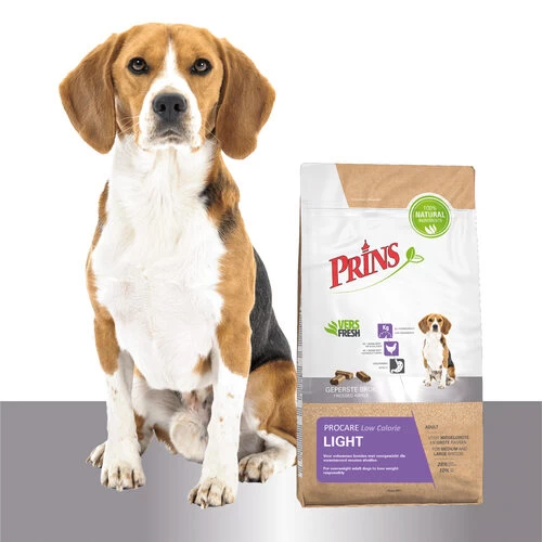 [Ist Ihr Hund (etwas) zu dick? Dann könnte das ProCare Light Low Calorie von Prins ein geeignetes Futter für übergewichtige erwachsene Hunde sein. Die gepressten Brocken enthalten einen geringen Fettgehalt und zusätzliche Ballaststoffe, die auf verantwortungsvolle Weise zum Abnehmen beitragen. Die Substanz L-Carnitin trägt zur Anregung des Fettstoffwechsels bei. Die zusätzlichen Ballaststoffe im Futter unterstützen das Sättigungsgefühl. Das Gleichgewicht der Nahrungsbestandteile trägt zu einer optimalen Kondition beim Abnehmen bei. Die Proteine von Huhn und Pute unterstützen das Wachstum, den Erhalt und die Kondition der Muskeln.